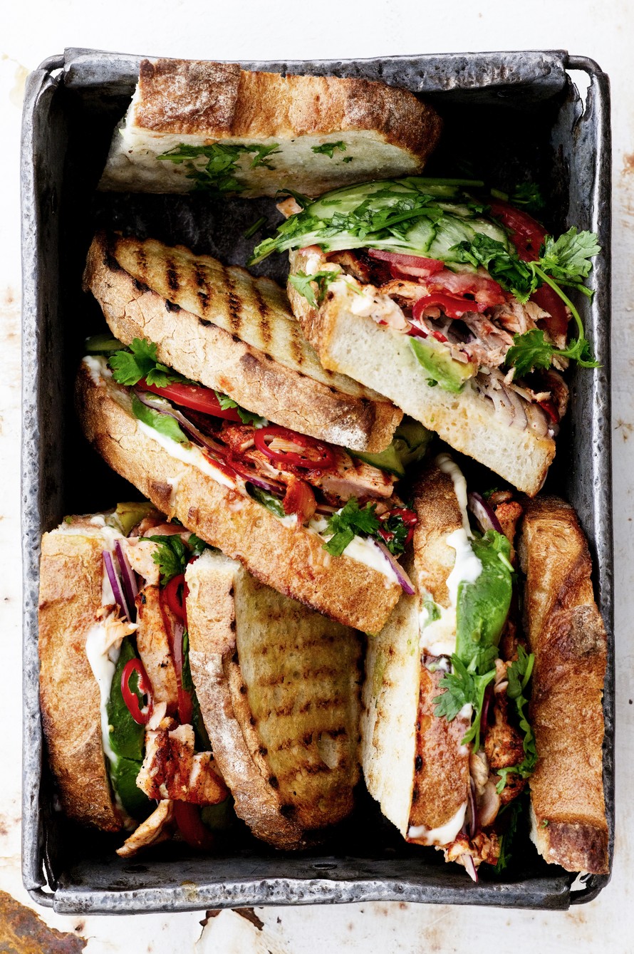 - Voitele leivät majoneesilla. Jaa ensin sipuli, sitten lohi, avokado, tomaatti, kurkku ja korianteri kahdelle leipäviipaleelle. Pirskota srirachaa päälle. Paina toiset leivät kevyesti kanneksi. Puolita sandwicheiksi.