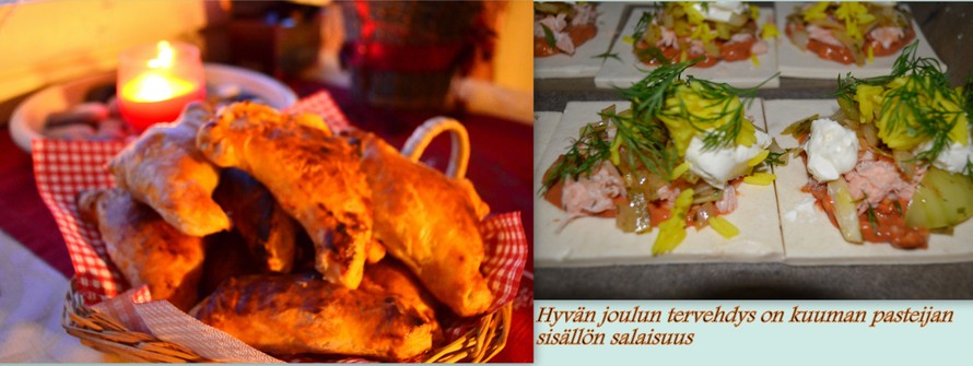 Keitä pitkäjyväinen riisi kattilassa ja lisää kurkuma maustetta mukaan kun se pehmenee. Sekoita kulhossa sinappia ja ketsuppia suunnilleen sama määrä ja hienonna valkosipuli ja lisää se ketsuppi-sinappi- seokseen. Paista sipulit öljyssä pannulla, ja lisää rakuunaa ja paprika maustetta niiden pehmetessä. Ota taikinalevyt sulamaan. Ota lohesta ruodot pois. Vatkaa kananmuna hyvin. Laita uuni päälle taikalevypohjien mukaisesti. Laita pellin päälle leivinpaperille neliöiksi jakamasi taikinalevyt ja jaa niihin ensin ketsuppi-sinappi seosta alimmaiseksi melko reippaasti jotta maku uunista tulleena ei olisi hävinnyt . Sitten laita sipuliseosta, lohta, riisiä, sulatejuustoa ja tilliä päällimmäiseksi. Sulje pasteijat kostuttamalla niiden sivut vedellä ensin ja liittämällä vastakkaiset sivut toisiinsa haarukalla painaen ne kiinni tiiviisti kolmion muotoon. Jotta pasteijaan saa paljon täytettä, tiivistä pasteijan sisintä ainesta työntämällä teelusikalla pasteijan toisesta päädystä jota et ole vielä sulkenut, aineksia pasteijan suljetumpaan suuntaan aivan päätyyn niin että tämä pääty pysyy kiinni, sulkemalla sitten myös avonaisemman päädyn. Näin saat täyteläisemmin täytetyn pasteijan kaikkia aineksia myöten. Voitele pasteijat kananmunalla ja laita uuniin paistumaan niin kauaksi aikaa kunnes ne rusehtuvat. Tarjoa glögi-juoman kanssa.