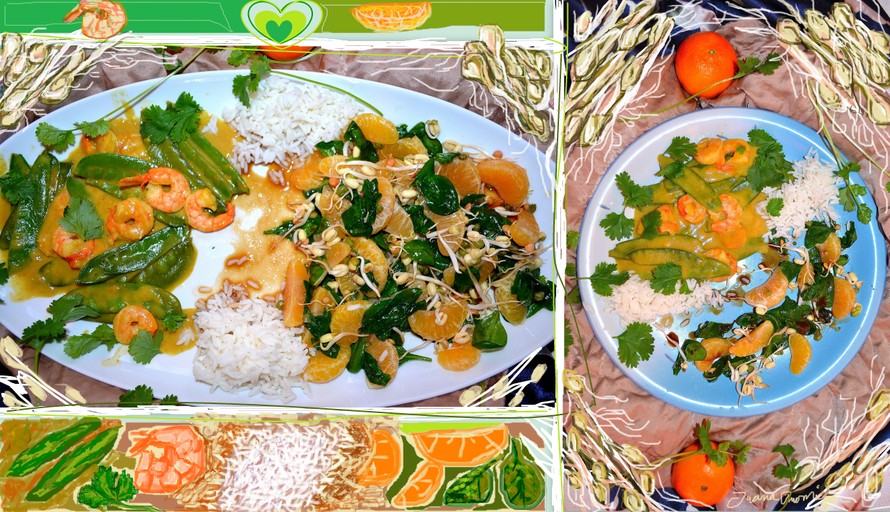 Lisää sokeriherneet curry pataan ja kuumenna 5- 10 minuuttia. Lisää lopuksi vasta katkarapu paria minuuttia ennen padan ollessa valmista ja anna olla pienellä lämmöllä koska ne käpristyisivät pienemmiksi suurella lämmöllä tai pidemmän aikaa kuumennettaessa, ja näin ollen vain isot katkaravut kuuluvat kuumiin ruokiin ja pienet ravut salaatteihin. Lisää myös korianteri yrtti joukkoon. Kuumenna öljy toisessa wokissa ja freesaa pinaatit, pavunidut ja mandariinin lohkot niin kauan kunnes pinaatinlehdet ovat nahistumaisillaan, alle 5 minuuttia. Siirrä vihannekset tarjoiluastiaan ja laita kattilaan tilalle mandariini-pinaatin liemi; kuumenna appelsiinimehu ja soijakastike hyvin nopeasti ja kaada liemi tasaisesti mandariini-pinaatin päälle tarjoiluastiaan riisi keskelle laitettuna. Mandariini-pinaattia voi syödä myös sellaisenaan soijakastike-appelsiinimehun ja riisin kanssa, hyvin helppo valmistaa.