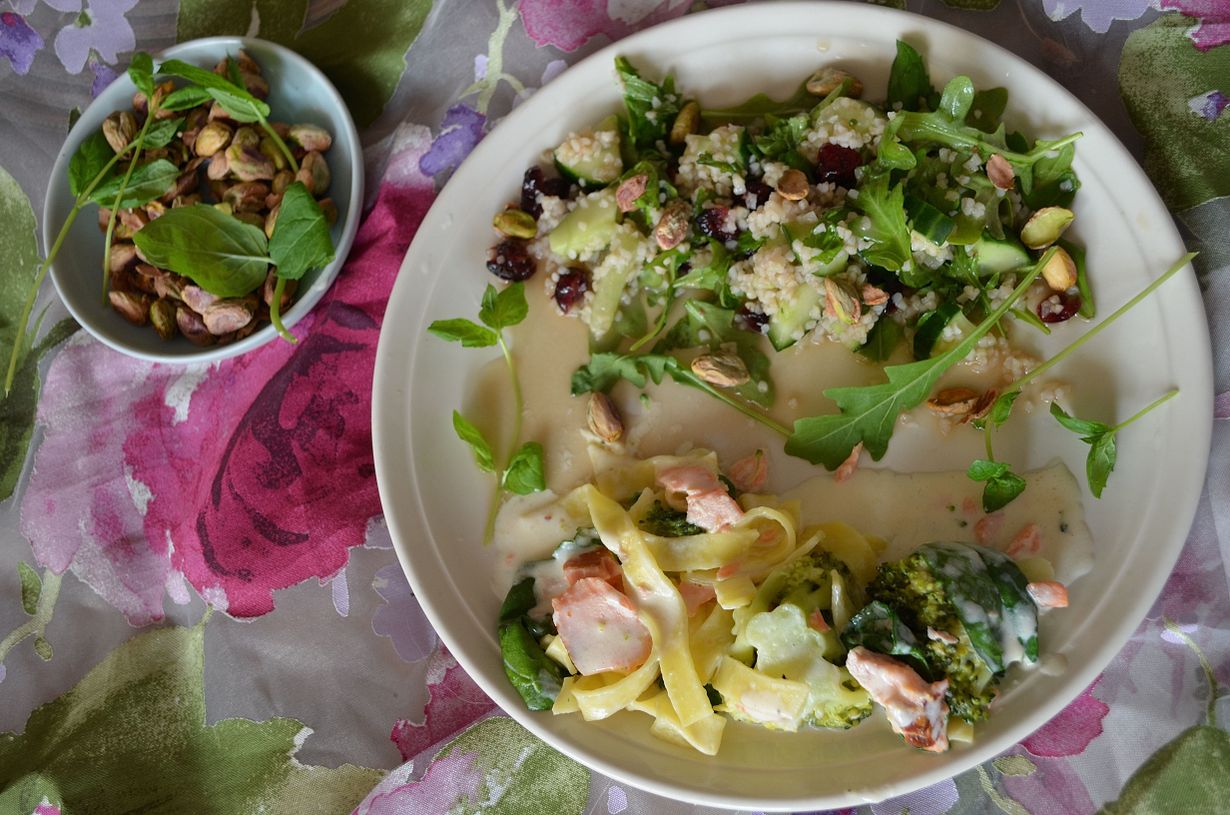 Eksoottisia salaatinmakuja miedon hienon lohi-parsa pastan oheen