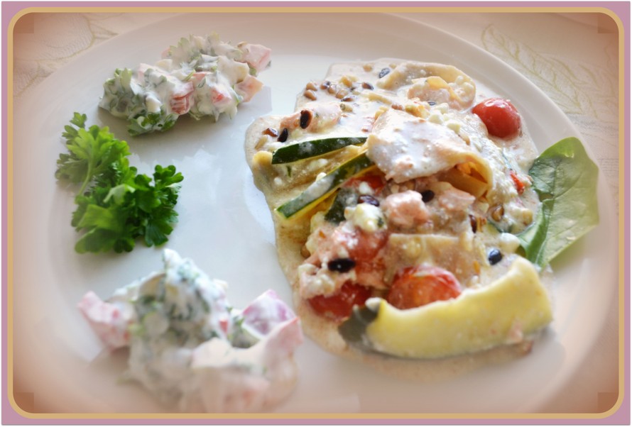 kesäkurpitsaa, pinaattia, pinjansiemeniä, ruokakermaa, kirsikkatomaatteja, täysjyvälasagnelevyjä, fetajuustoa (tähän ei käy salaattijuustokuutio, koska se menee uuniin), kirjolohisuikaletta(ei savustettua), kermaviili, kapris, suolakurkku, sinappi, persiljaa, paprikaa