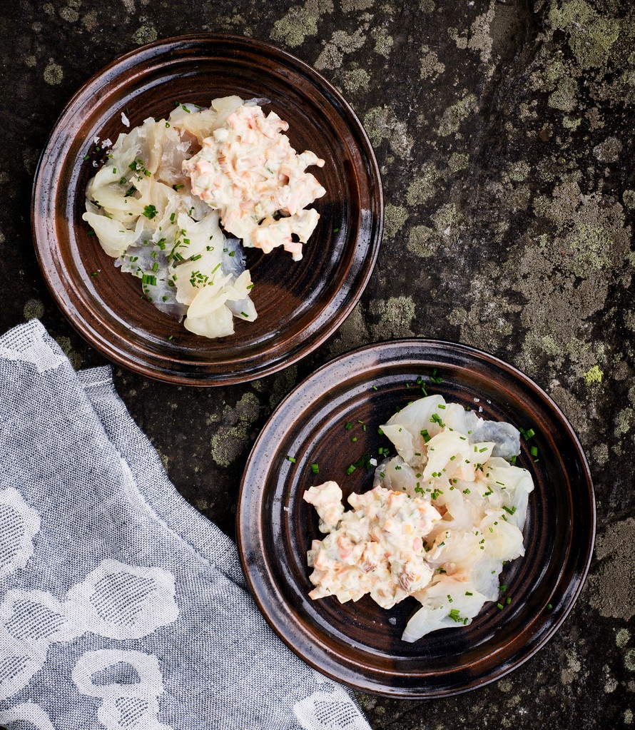 Ota fileet astiasta ja taputtele molemmin puolin talouspaperilla kuivaksi. Leikkaa fileet fileointiveitsellä ohuiksi viipaleiksi ja tarjoa kantarelliremouladen kanssa. Jos et tarjoa kalaa heti, laita se puhtaaseen astiaan ja säilytä jääkaapissa.