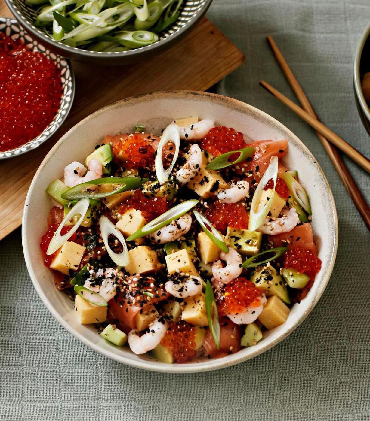 Juhlapöytään kelpaava sushikulho on makujen ja koostumusten ilotulitus. Vaikeasta nimestään huolimatta valmistus on helppoa, sillä riisiä lukuunottamatta mitään ei tarvitse kypsentää.