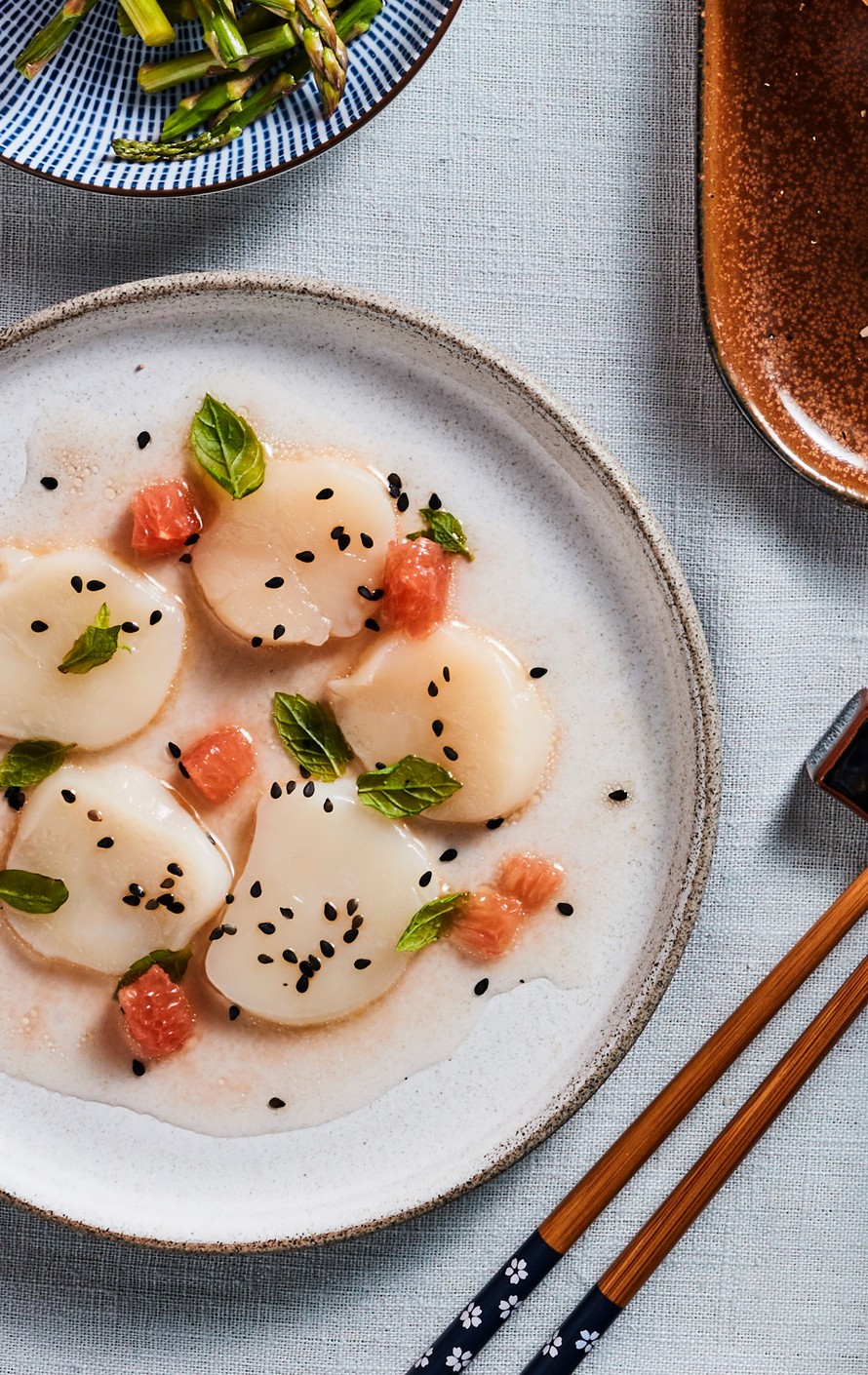 Pyyhi kampasimpukat kuiviksi ja leikkaa ne 3–4 viipaleeseen. Jaa viipaleet lautasille.