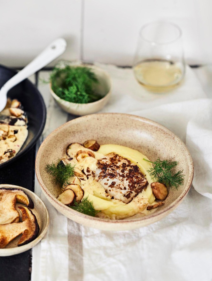 Tarjoa kalat paistettujen sienten ja perunamuusin kanssa. Valuta päälle ruskistettua voita. Viimeistele tillillä. Tarjoa halutessasi vihreää salaattia tai höyrytettyjä vihreitä kasviksia.