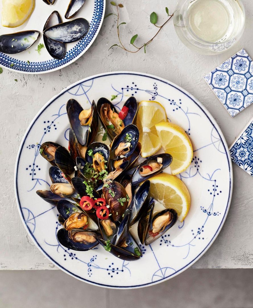- Poimi avautuneet simpukat tarjoiluastiaan ja peitä foliolla. Heitä avautumattomat simpukat pois.