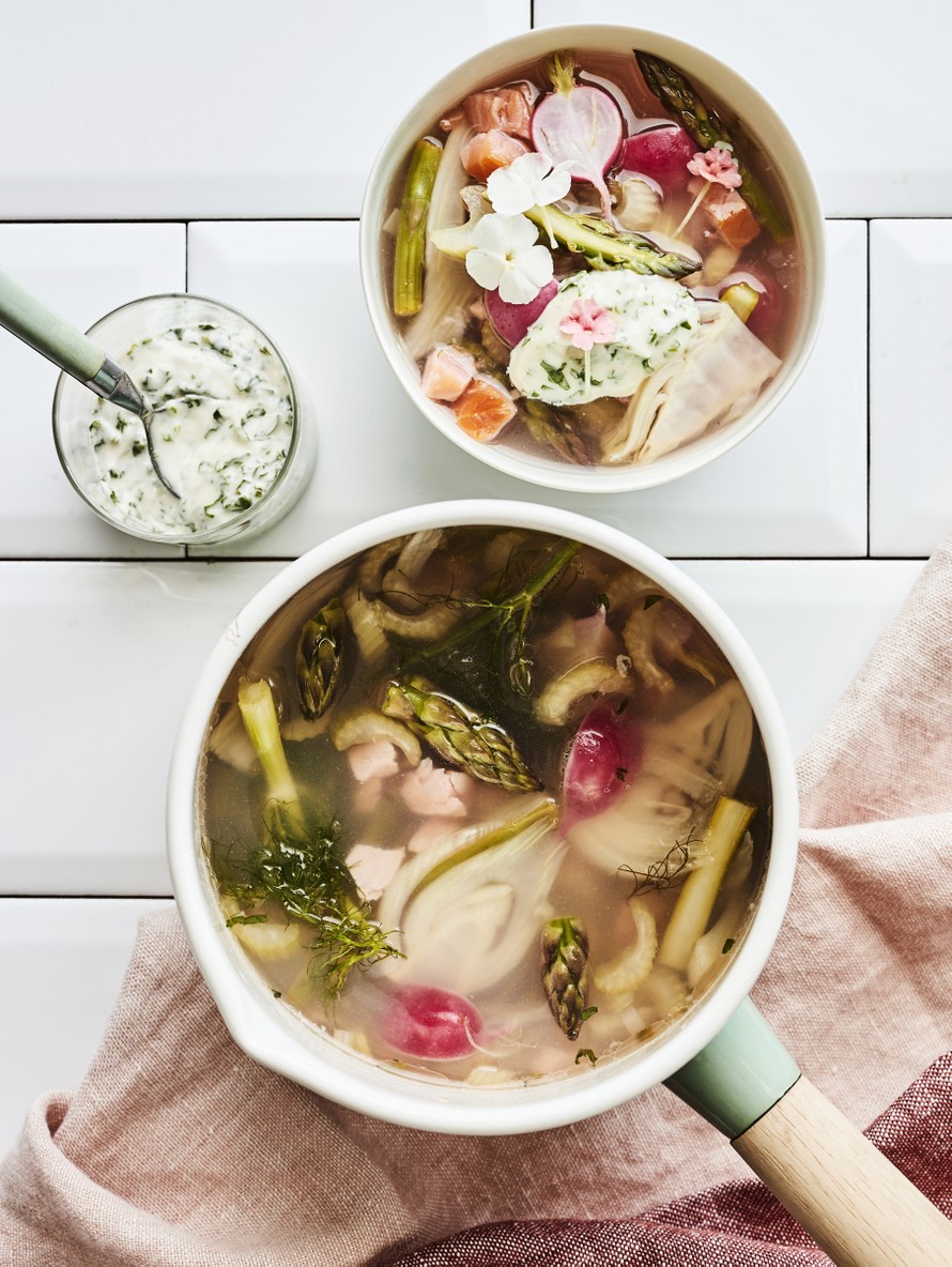 Keväisessä lohisopassa on perunoiden tilalla parsaa. Raikkaassa viiniliemessä maistuvat varsiselleri ja fenkoli.