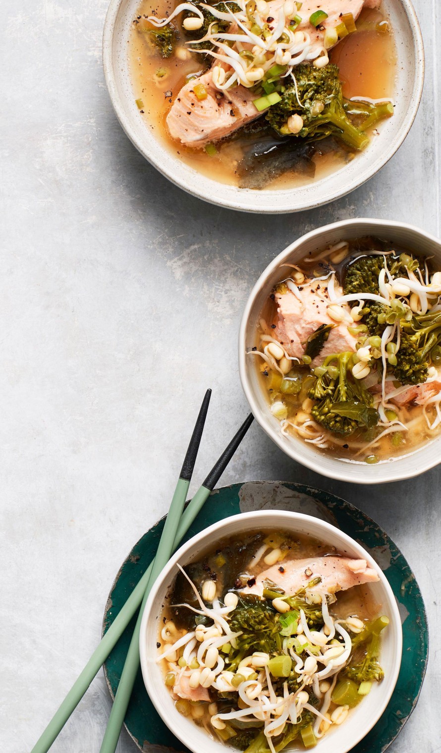 - Lisää lohi, parsakaali, idut ja kevätsipuli liemeen ja keitä noin 5 minuuttia, kunnes kala on kypsää. Jaa keittokulhoihin ja lisää ituja päälle.
