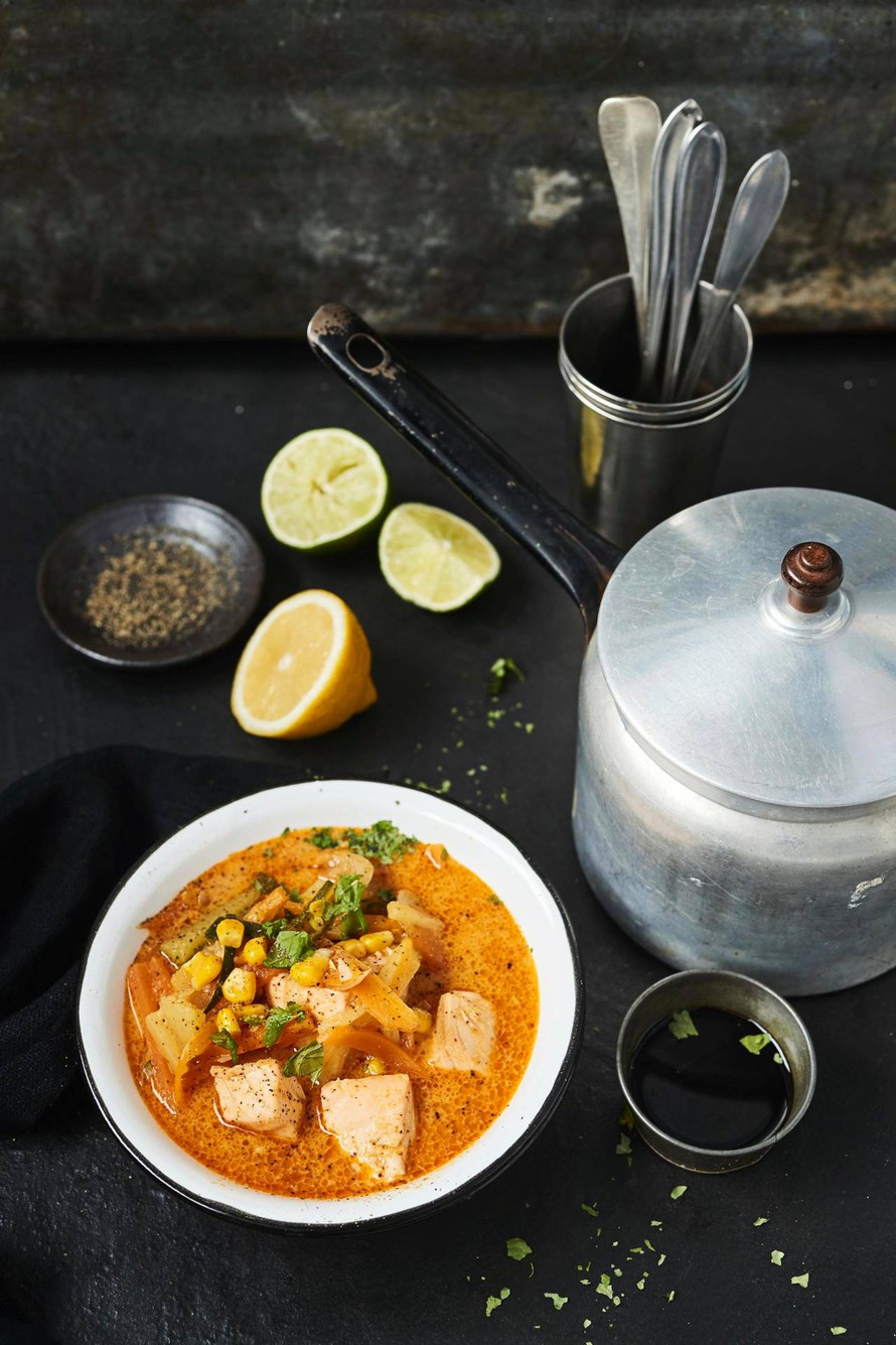 Currytahna ja kookosmaito tuovat lohikeittoon thaimaalaista makua.