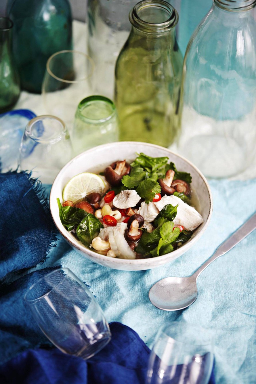 Tämä raikas kalakeitto valmistetaan siiasta, jonka rasvaisuus sopii kirkkaaseen liemeen. Liemi maustetaan tällä kertaa thaityyliin sitruunaruoholla, inkiväärillä ja lorauksella kalakastiketta. Chilin määrää säätelemällä saa keiton mausta omaan suuhun sopivan tulisen.