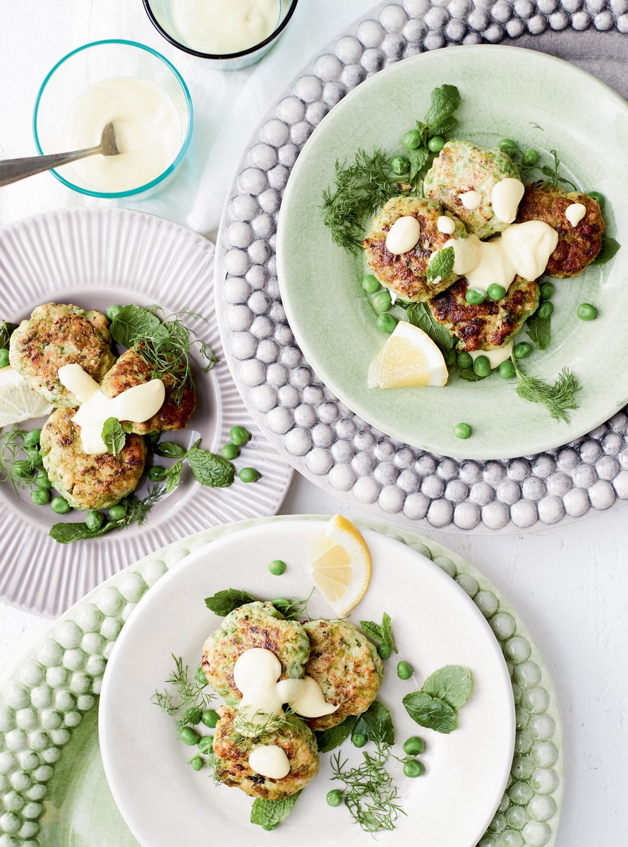 - Hienonna sulatetut herneet ja kaprikset kulhossa sauvasekoittimella. Lisää joukkoon jauhettu hauki, kermaviili, minttu, tilli, sinappi ja suola. Sekoita tasaiseksi.