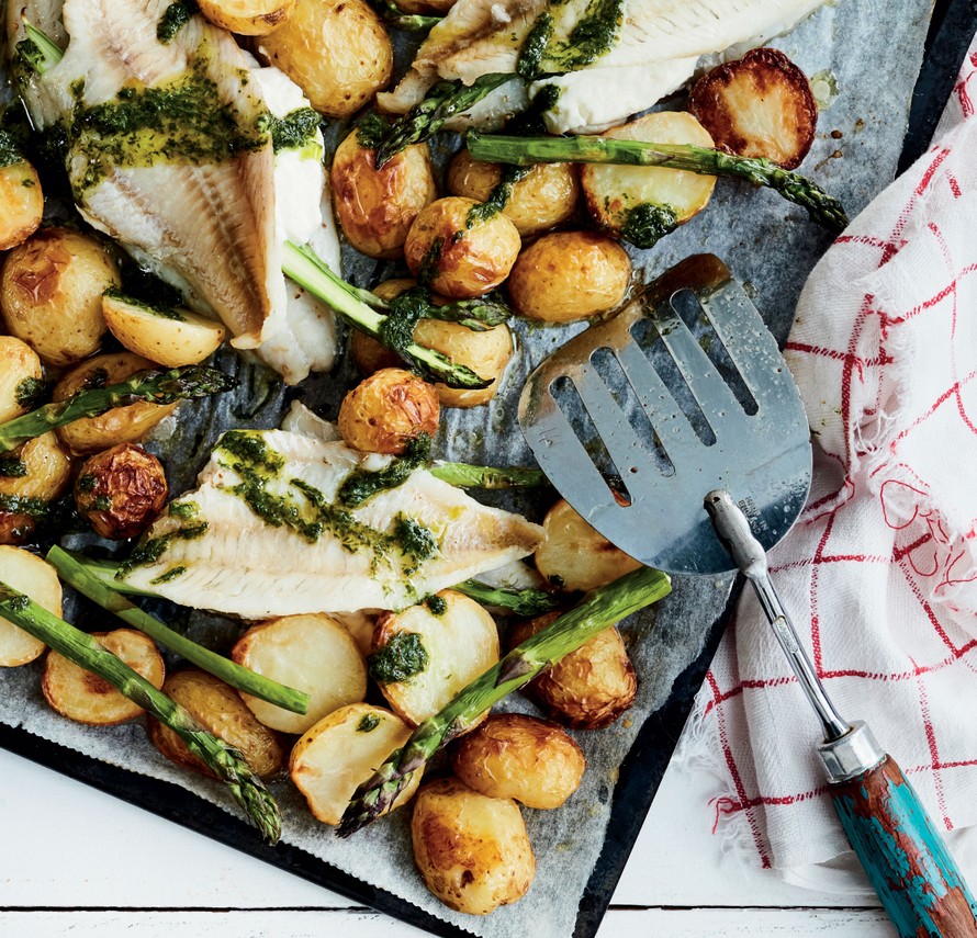 - Ota pelti uunista, kun perunat ovat kypsyneet noin 10 minuuttia, ja nostele täytetyt ahvenfileet perunoiden joukkoon. Lisää myös yli jääneet parsat pellille. Jatka kypsennystä noin 10 minuuttia tai kunnes ahvenet ovat kypsiä eli niiden väri on muuttunut vaaleanpunaisesta valkoiseksi. Perunoiden kokonaiskypsymisaika on reilu 20 minuuttia.