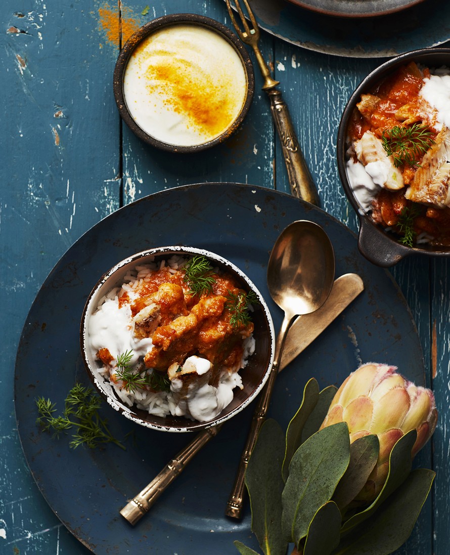 Valmiin currytahnan ansiosta intialainen kalapata on supersimppeli ja kaappien maustekavalkadi säilyy maltillisena.