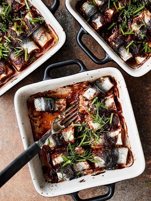 - Valuta anjoviksista liemi kulhoon, lisää kerma ja mustapippuri. Asettele fileet vuokaan tasaisin välein. Lisää loput perunat.