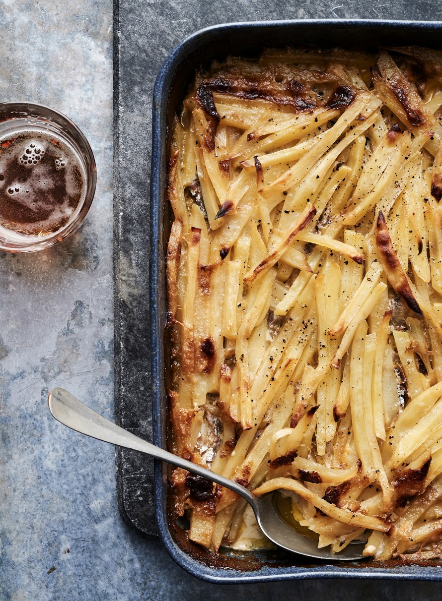 Perunakerrosten väliin lisätään kuullotettua sipulia ja anjovisviipaleita. Anjovisliemestä ja kermasta sekoitettu liemi tekee mausta samalla täyteläisen ja luonteikkaan. Kiusaus saa viettää uunissa tunnin tai hieman kauemminkin, kunnes perunat tuntuvat haarukalla kokeiltaessa kypsiltä.