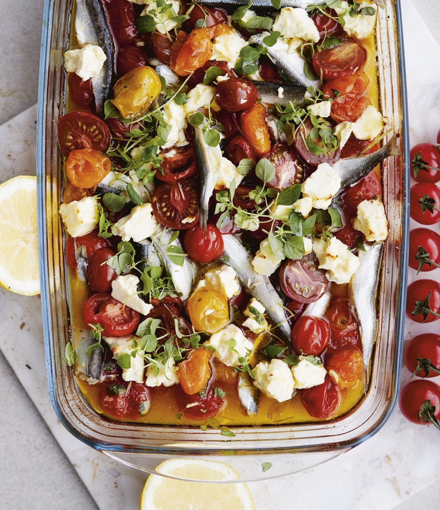 Nyt on helppoa! Tomaatit uuniin 10 minuutiksi, kalat päälle ja vuoka takaisin uuniin 10 minuutiksi. Muikut tykkäävät tomaattien hapokkaanmakeasta meiningistä, ja maun kruunaa ihanan suolainen feta.