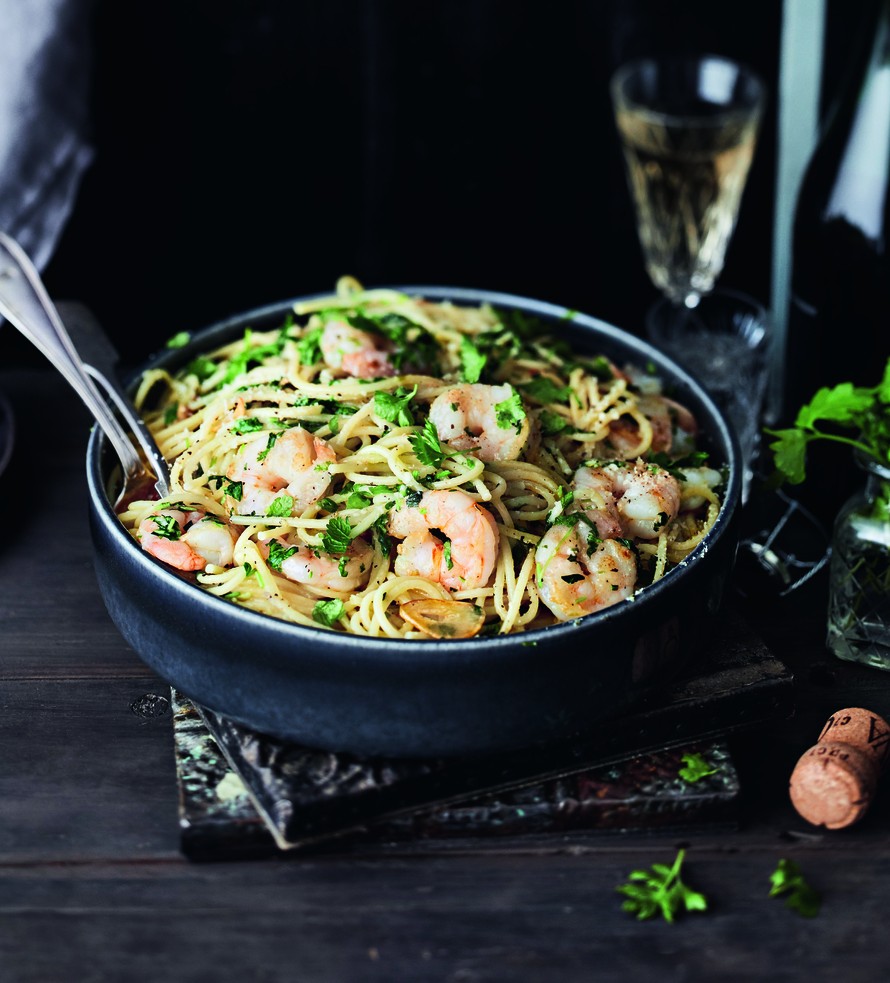 20 minuutin luksusta! Valkosipulin, chilin ja lehtipersiljan maustamat jättiravut saavat viimeisen silauksen valkoviinistä.