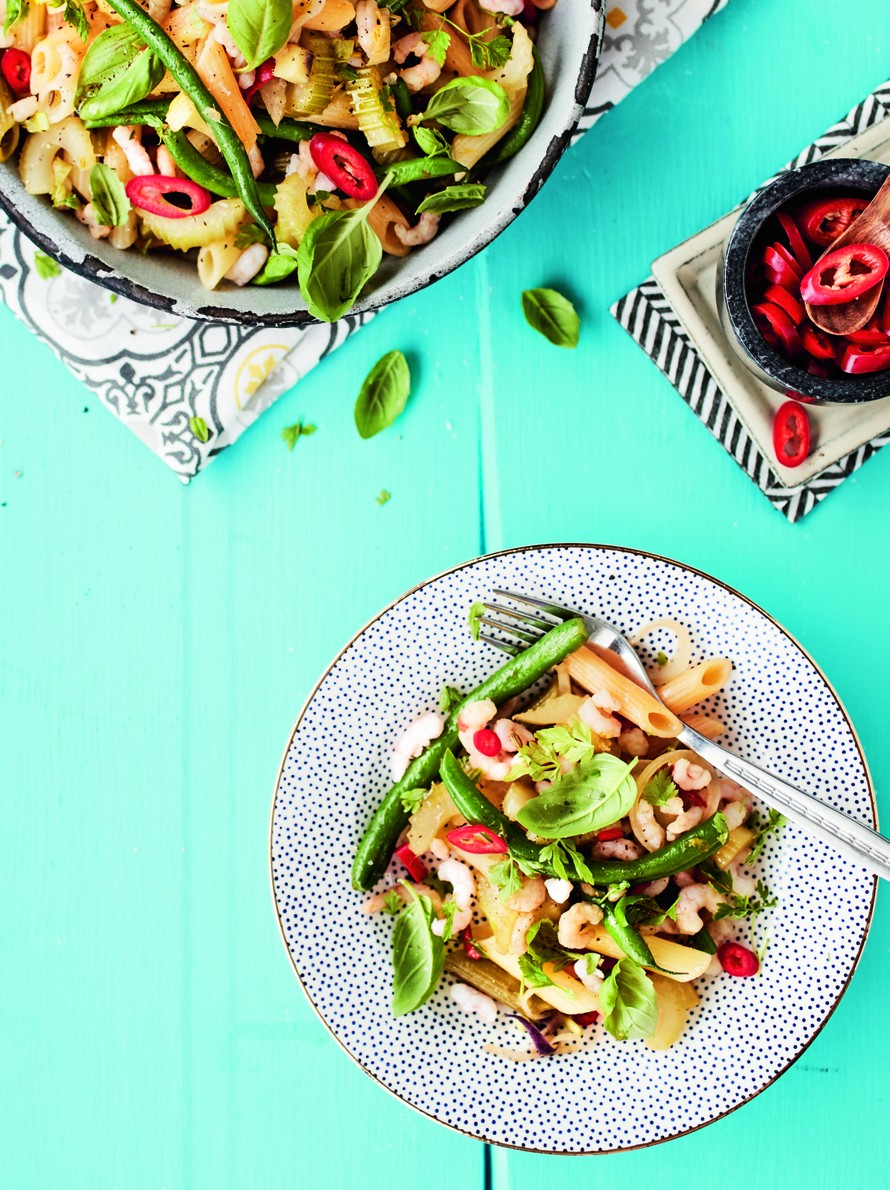 Gluteenitonta pastaa valmistetaan niin maissista, riisistä, hirssistä kuin pavuistakin. Maista vaihteeksi vaikkapa tattaripastaa tulisten katkarapujen kera. Lehtikaali ja pavut viimeistelevät terveellisen ja maukkaan aterian.