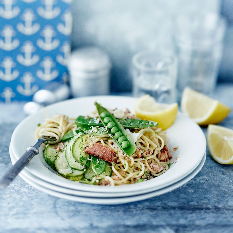 - Ota noin ½ dl keitinvettä talteen, kun valutat pastan ja kasvikset. Lisää keitinvesi pannussa olevaan kalaseokseen. Yhdistä kalaseos kuumaan pastaan. Lisää öljyä, jos pasta tuntuu liian kuivalta.