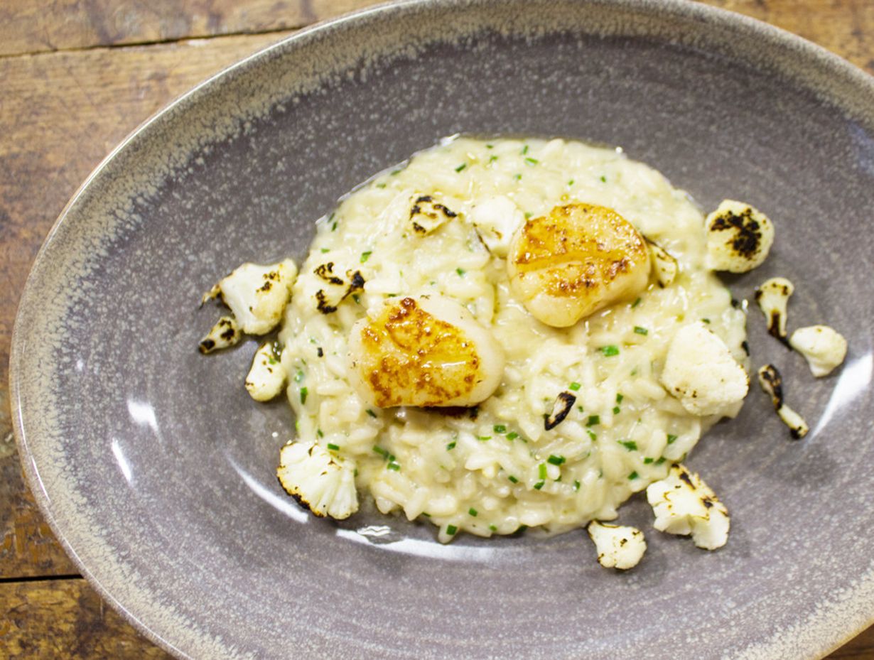 - Jaa risotto lautasille, lisää päälle paahdetut kukkakaalin nuput. Asettele kampasimpukat risoton päälle ja tarjoa heti.