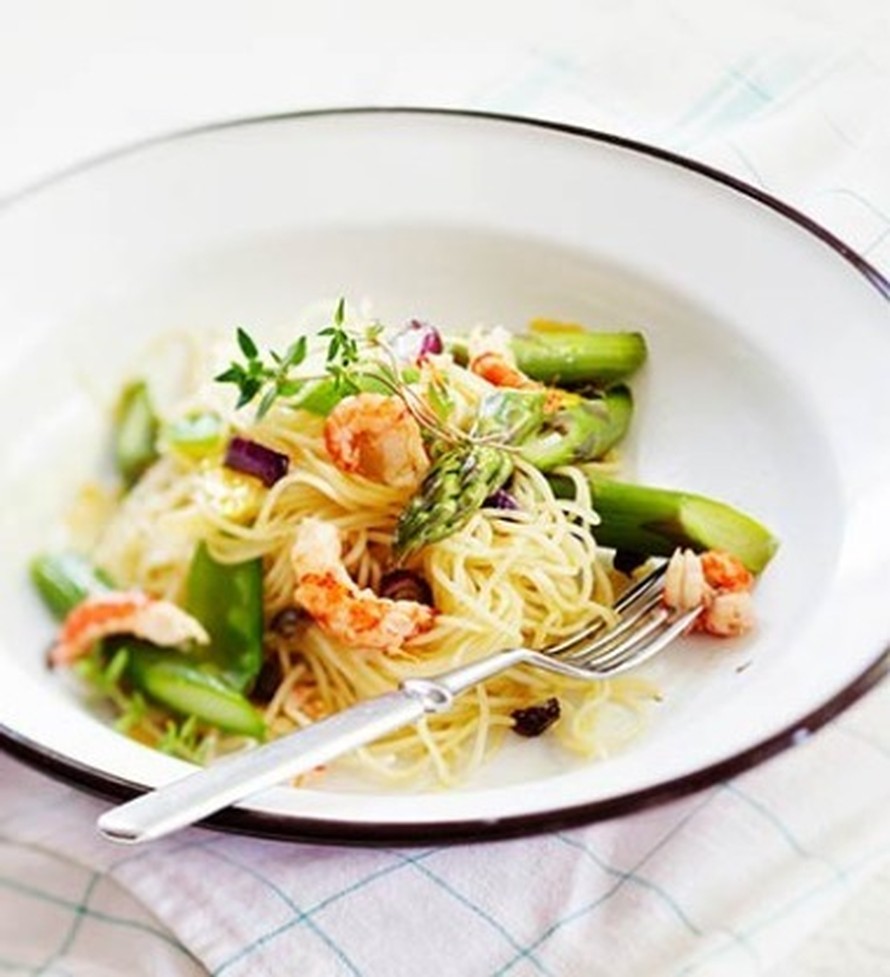 - Huuhdo sokeriherneenpalot ja parsat ja poista parsoista kuiva tyviosa. Sulata voi pannulla ja lisää sopiviksi suupaloiksi pilkotut parsat ja sokeriherneet. Paista hiljalleen käännellen noin 3 minuutin ajan tai kunnes parsapalat tuntuvat kypsän napakoilta. Lisää pannulle sitruunan mehu ja -kuori ja valutetut jättikatkaravunpyrstöt. Kääntele seosta hetken ajan, kunnes katkaravut ovat lämmenneet, mutta varo, ettei ravunliha sitkisty.