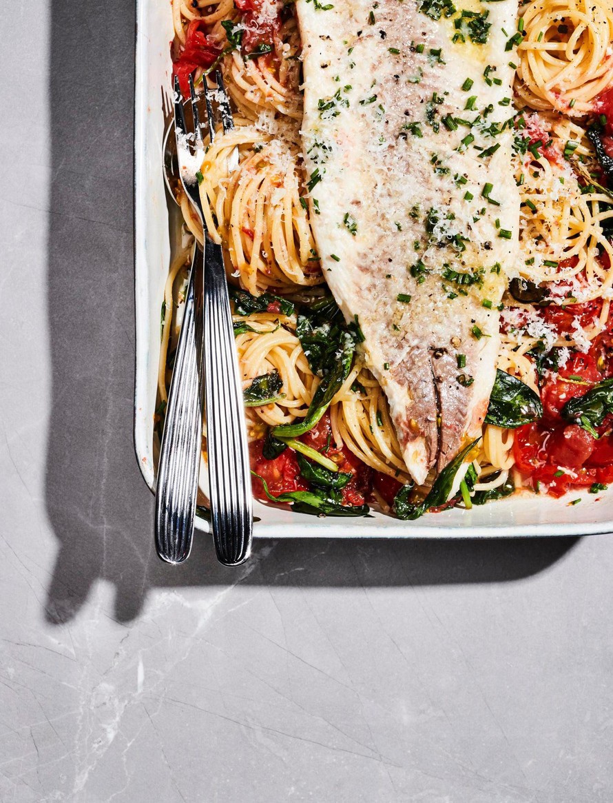 Nosta kypsä kala ja kasvikset uunista. Nosta kalafileet nahkoineen varovasti hetkeksi folioon. Kaada pasta vuokaan ja kääntele sekaisin tomaattien, pinaatin ja parmesaanin kanssa. Kumoa kalat takaisin nahkapuoli ylöspäin pastan päälle, vedä nahka pois ja ripottele ruohosipulia pinnalle.