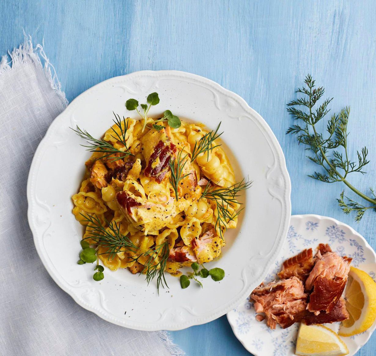 Kermainen lämminsavulohipasta huutaa kesää. Currylla maustettu kastike tuo vaihtelua totuttuun makuun.