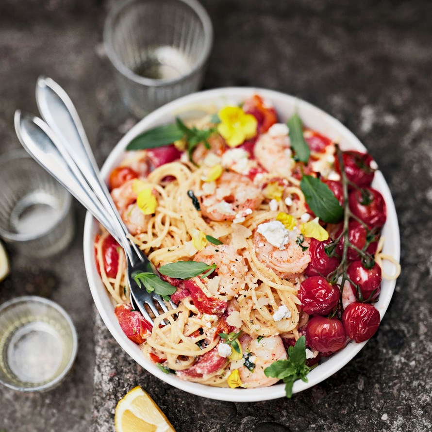 Tässä on viikonlopun huipennus! Kesytä feta ja tomaatit uunissa, paista jättikatkat valkosipuliöljyssä ja sekoita pastaan.