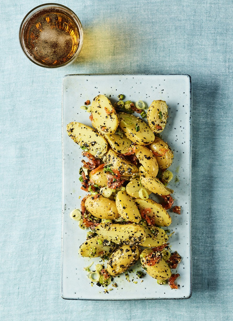 - Harjaa perunat huolellisesti. Keitä ne napakan kypsiksi suolalla maustetussa vedessä (1 tl suolaa/1 l vettä), noin 15 minuuttia. Valuta ja jäähdytä.