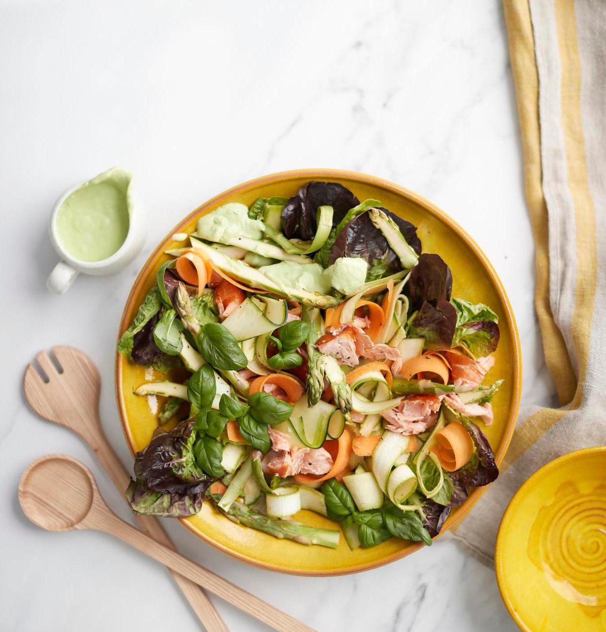 Sekoita kastike salaatin joukkoon ja tarjoile heti.