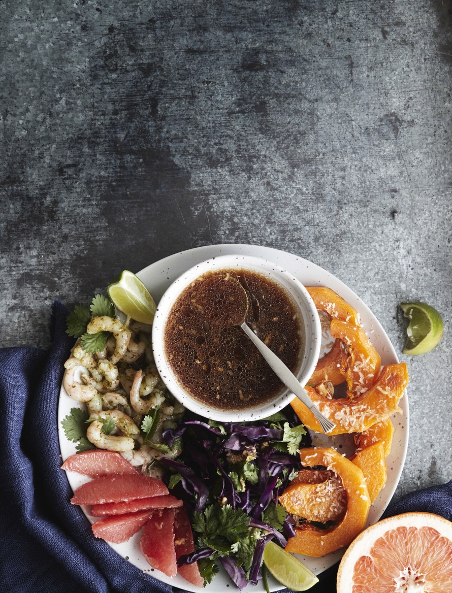 Katkarapu-kurpitsasalaatti ja inkiväärikastike
