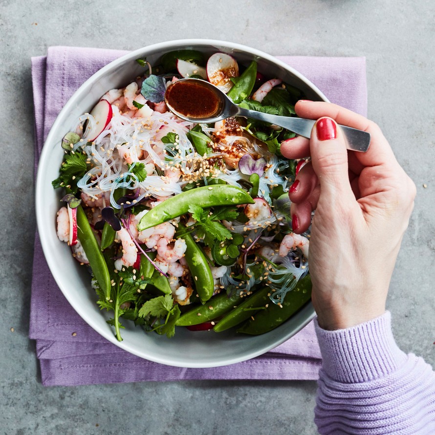 Hetkessä valmistuva katkarapu-lasinuudelisalaatti vie ajatukset Aasiaan: salaatti kruunataan misokastikkeella ja paahdetuilla seesaminsiemenillä.