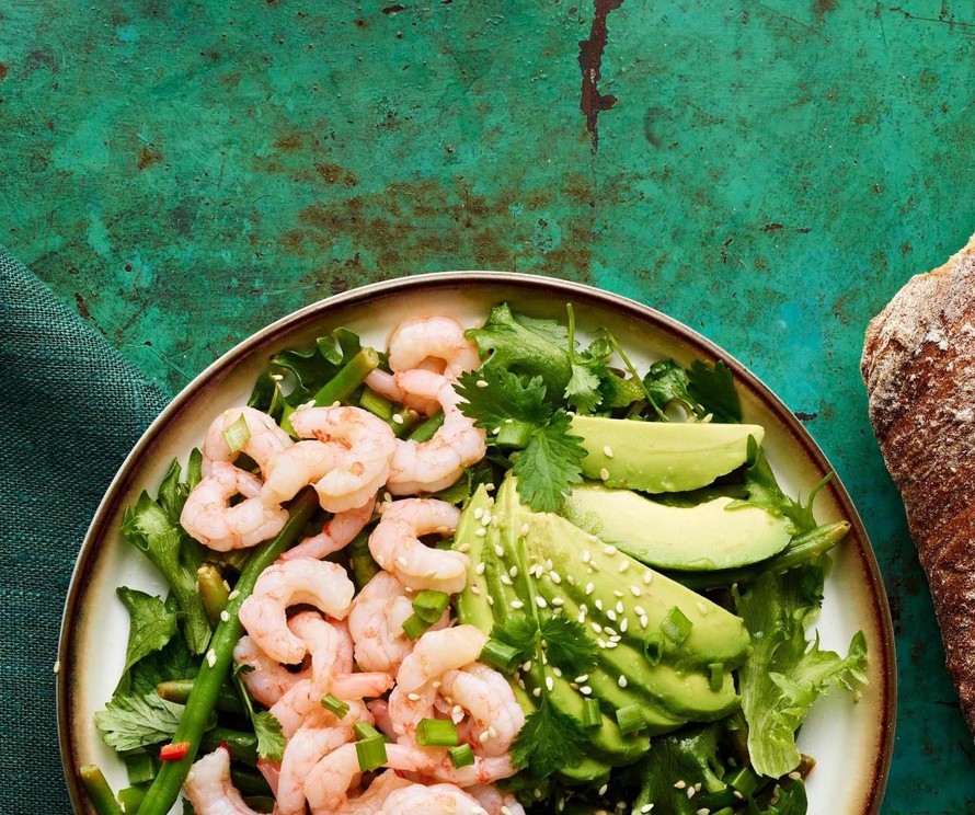 Valmista kerralla isompi satsi raikkaita papuja. Lisäämällä joukkoon katkarapuja, saat maukkaan ja tuhdin salaatin.