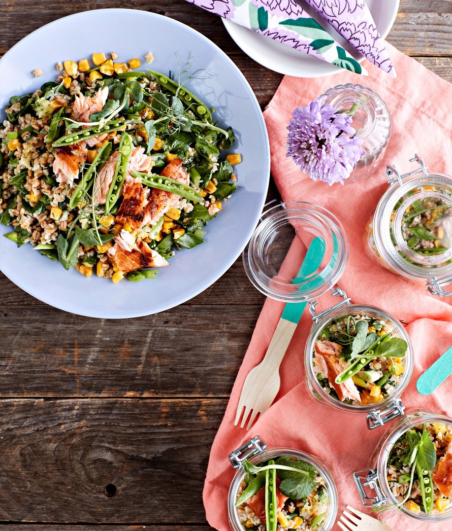 Keväinen lämminsavulohi-jyväsalaatti