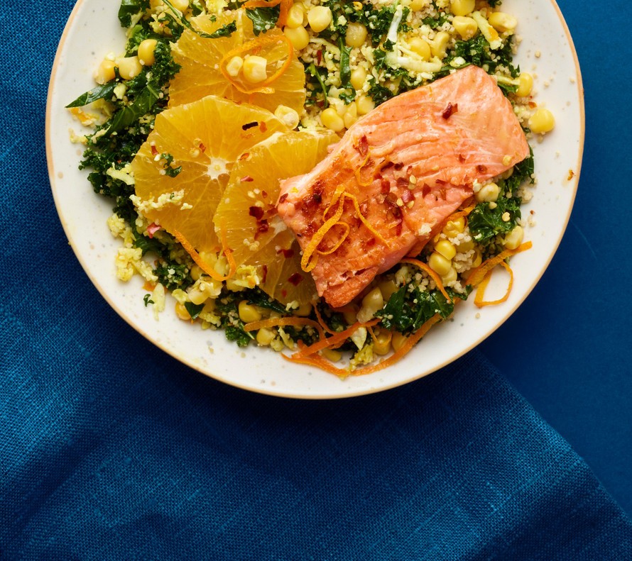 Sekoita keskenään kuskus, maissi ja marinoitu kaali. Jaa salaatti lautasille ja nosta appelsiini-viipaleet ja lohipalat päälle.