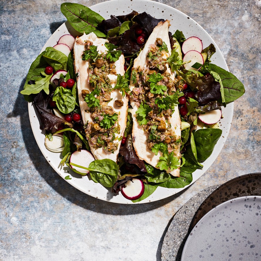 Kypsennä ensin, marinoi sitten! Pannulla paahdettu siika saa maustua yrtti-kaprismarinadissa sillä aikaa, kun kasaat salaatin.