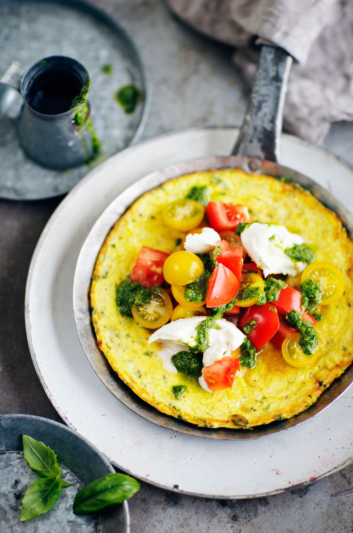 - Levitä tomaatit ja revitty mozzarella kypsälle frittatalle. Lusikoi kastiketta päälle ja tarjoa heti.