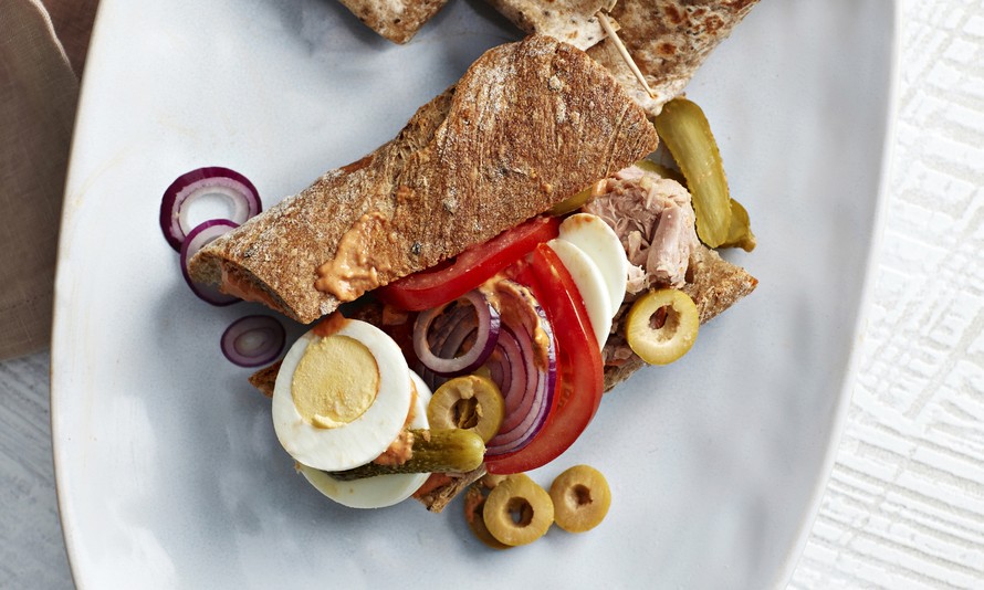 Sekoita majoneesi ja harissa keskenään. Keitä kananmunat koviksi, anna jäähtyä ja viipaloi. Valuta tonnikala. Viipaloi tai kuutioi tomaatti, kuori ja leikkaa punasipuli renkaiksi. Valuta oliivit ja minikurkut. Hienonna lehtipersilja. Halkaise minipatongit ja voitele molemmin puolin harissamajoneesilla.