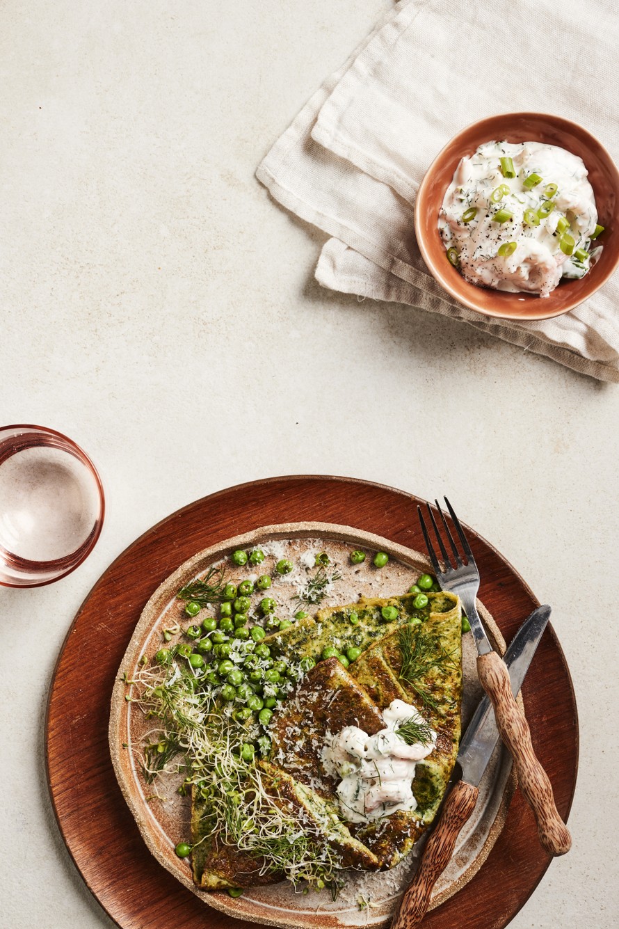 Kun pakkasessa on aina pussi herneitä ja pinaattia, on raikkaan vihreä lounasmunakas vain parinkymmenen minuutin päässä. Helppo skagenröra antaa lisäproteiinia annokseen.