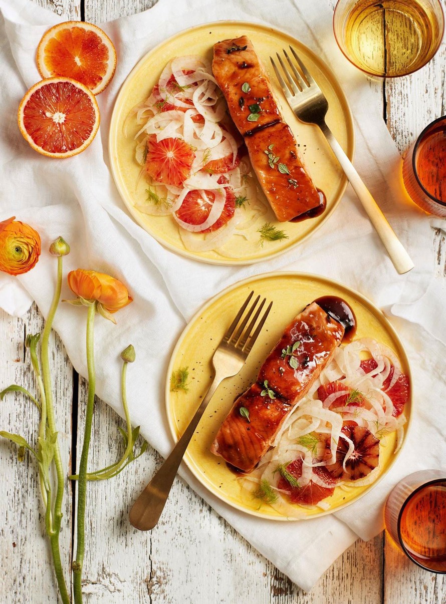 Veriappelsiineista on helppo puristaa mehua lohen tahmeaan kastikkeeseen. Raikas fenkoli on herkullista rouskuteltavaa mehevän kalan kanssa.