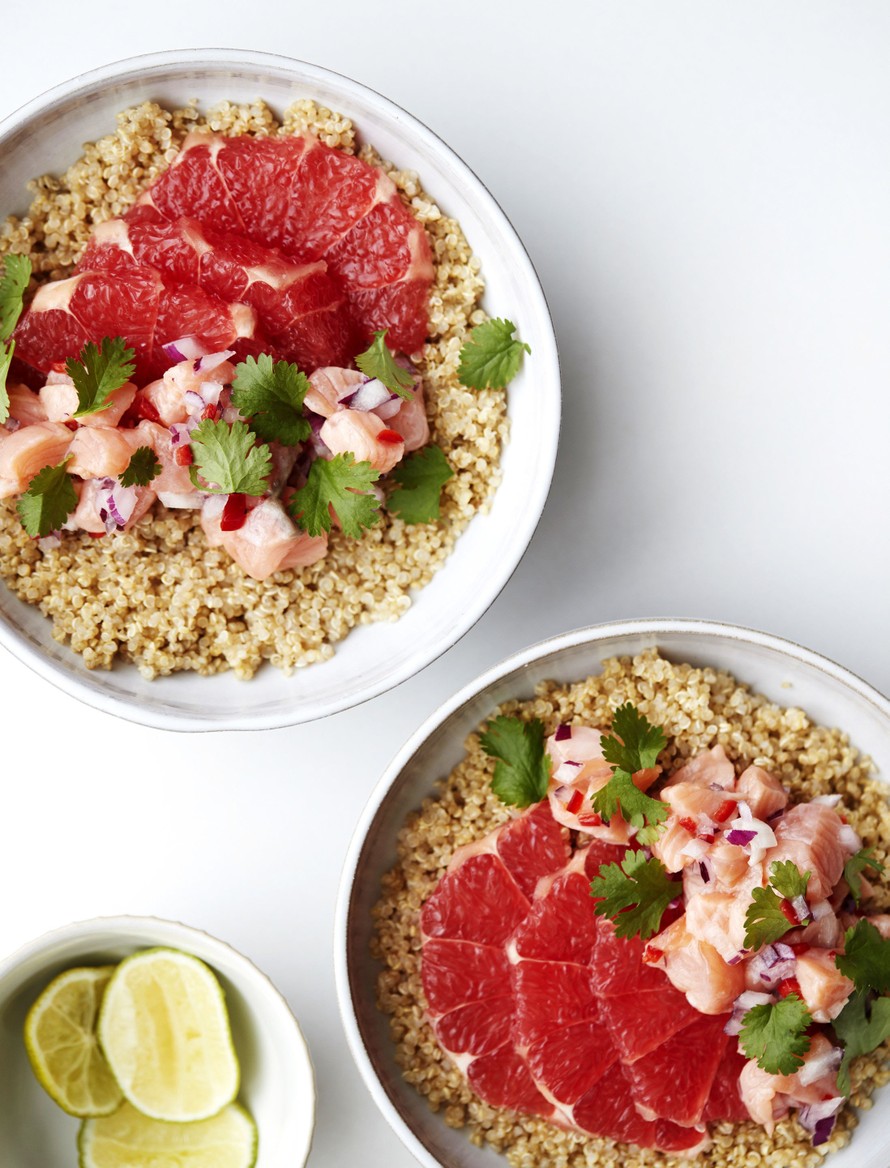 Kvinoaa, verigreipin ja limetin pehmeäksi kypsentämää lohta ja korianteria. Cevichekulho on terveellistä ja koukuttavan herkullista pikaruokaa, joka jättää hyvän olon.