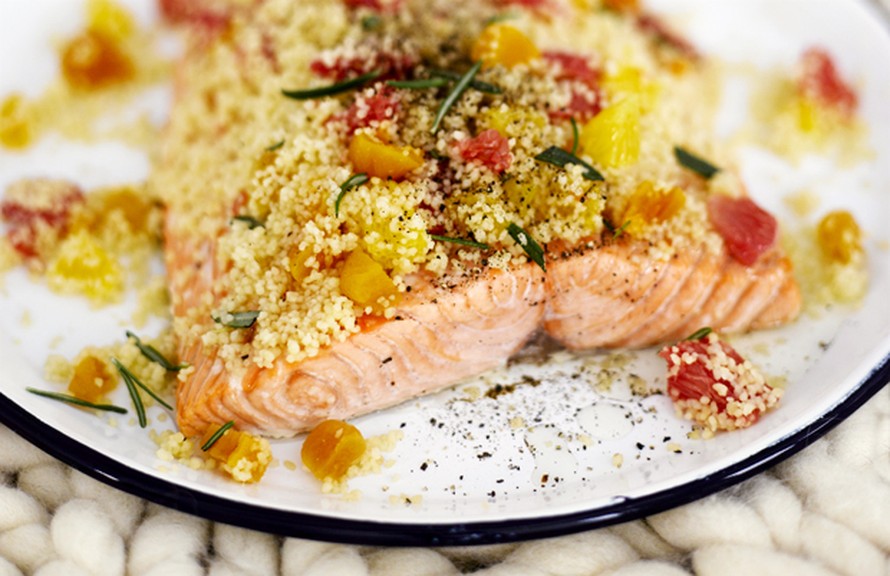- Levitä couscous kypsän kalan päälle. Rouhi päälle mustapippuria.