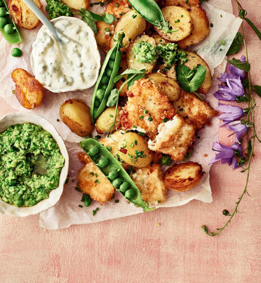 Tee murskatut minttuherneet (ohje alla). Tarjoa kalat ja perunat lämpimien herneiden ja sitruunalohkojen kanssa.