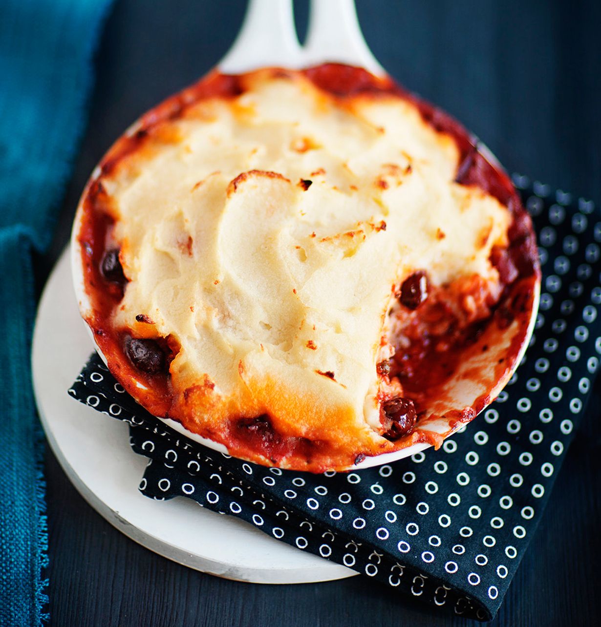 - Tee kastikkeen hautuessa muusi pakkauksen ohjeen mukaan veteen, maitoon tai kasvisliemeen. Laita kastike uunivuokaan. Lusikoi päälle perunamuusi. Nosta vuoka 250-asteisen uunin ylätasolle. Anna paistua noin 5 minuuttia tai kunnes muusi saa hieman väriä. Tarjoa sellaisenaan tai vihreän salaatin kera.