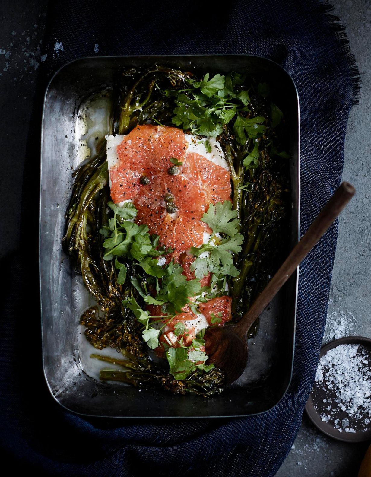 Kuhafileet kypsyvät uunissa meheviksi ja kirpeän maukkaiksi greippi-viipaleiden alla. Samalla pellillä kalan lisukkeeksi kypsyvät rautaa pursuavat varrelliset parsakaalit eli broccoliinit. Ne voit korvata myös pilkotulla tavallisella parsakaalilla.