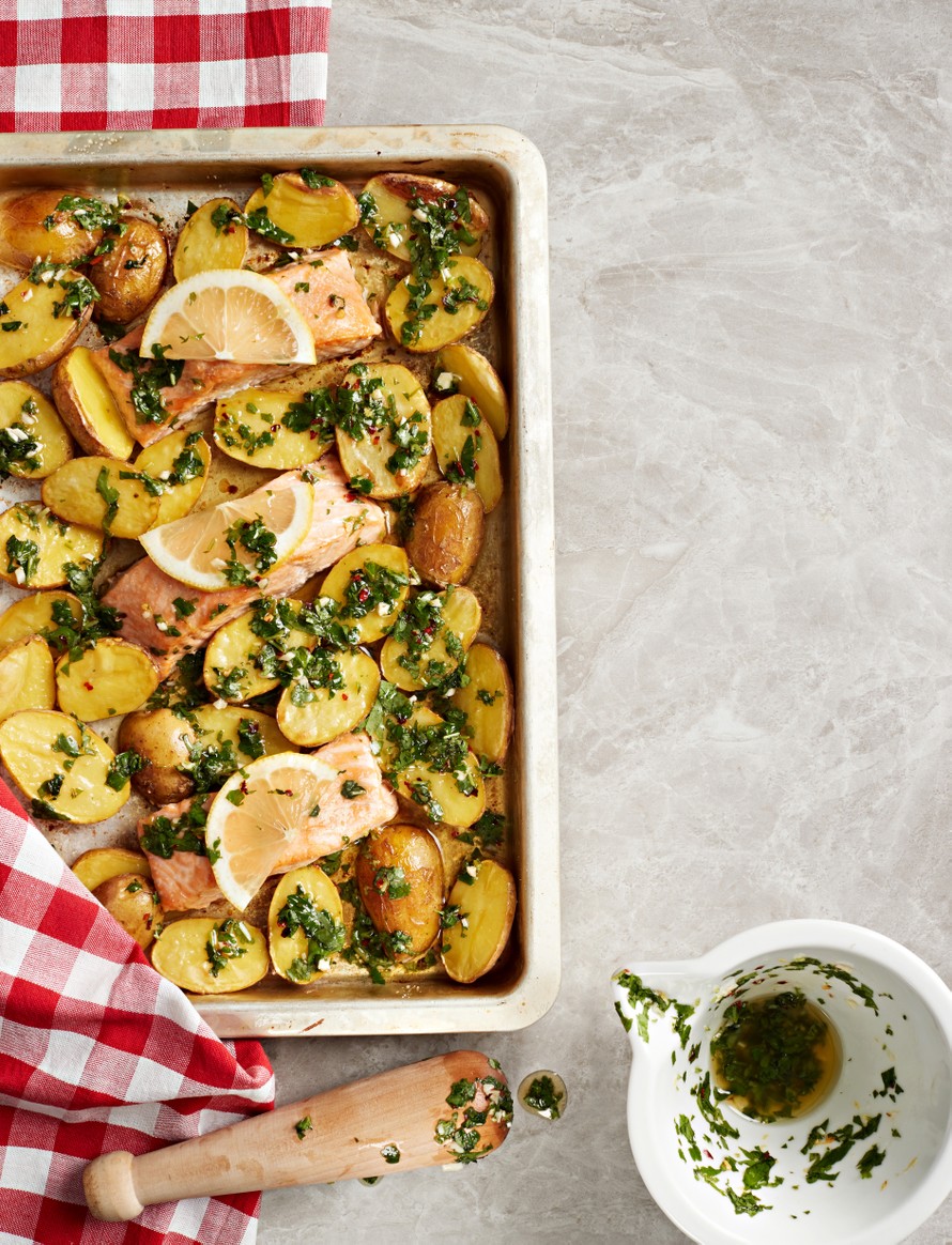 Nosta kypsä lohi-perunapelti uunista ja lusikoi gremolata päälle.