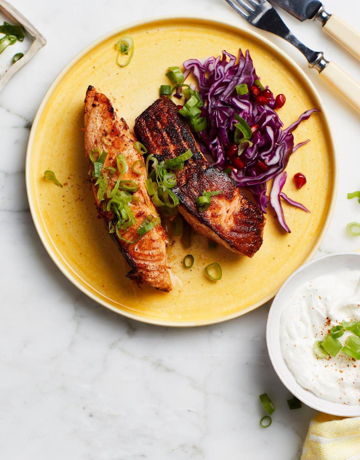 Laita jogurttilohet lautasille ja suikaloi päälle kevätsipulia. Tarjoa salaatin tai paahdettujen kasvisten kanssa.