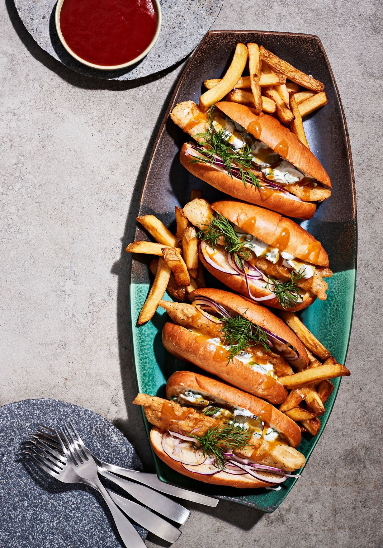 Laita kalapuikot, tartar-kastiketta, suikaloitua sipulia ja makeaa sinappia sämpylöiden väliin, tarjoile heti. Halutessasi lisää annoksiin paistettuja ranskiksia.