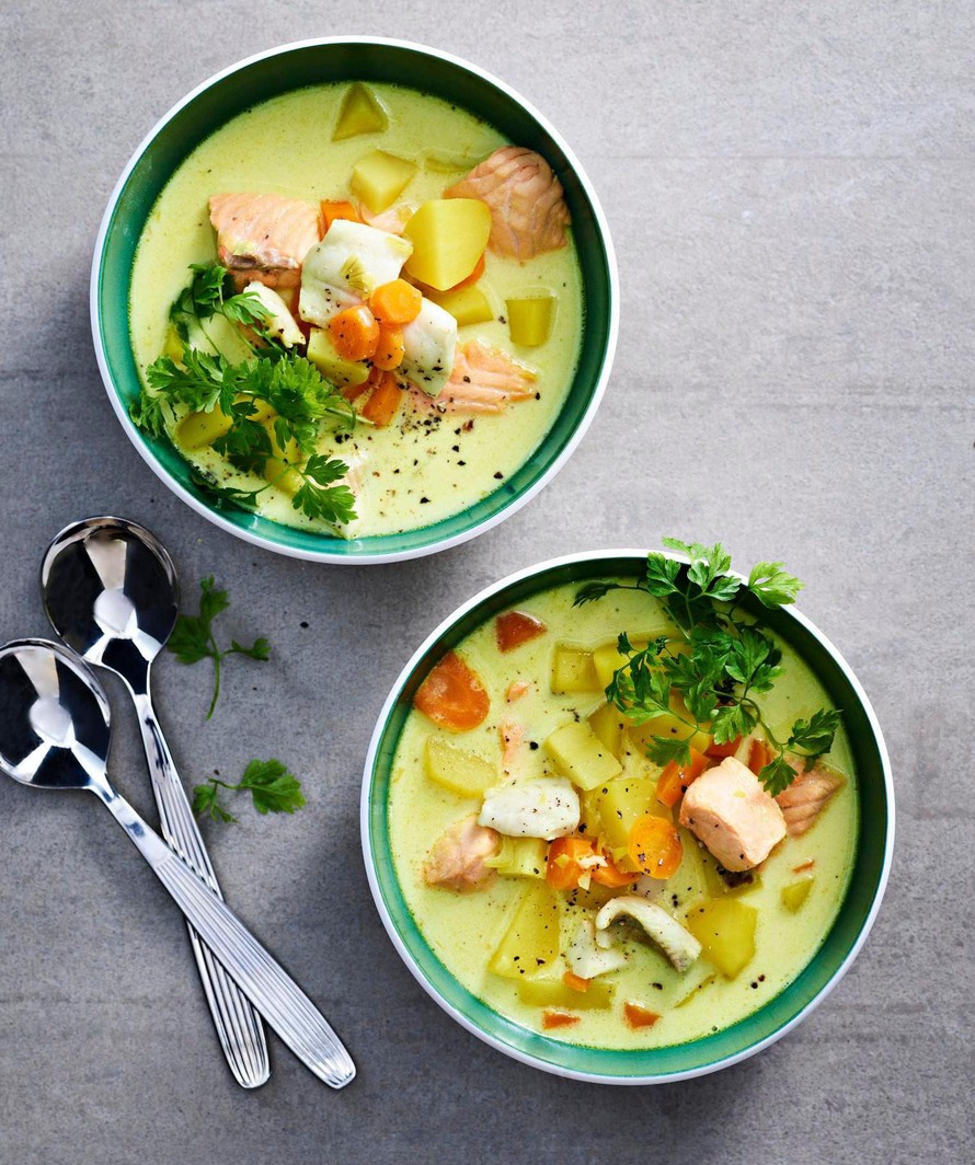 Leikkaa kala kuutioiksi. Lisää kalakuutiot ja kaurakerma keittoon ja kuumenna vielä kiehuvaksi. Mausta keitto pippurilla, suolalla ja tuoreella kirvelillä.