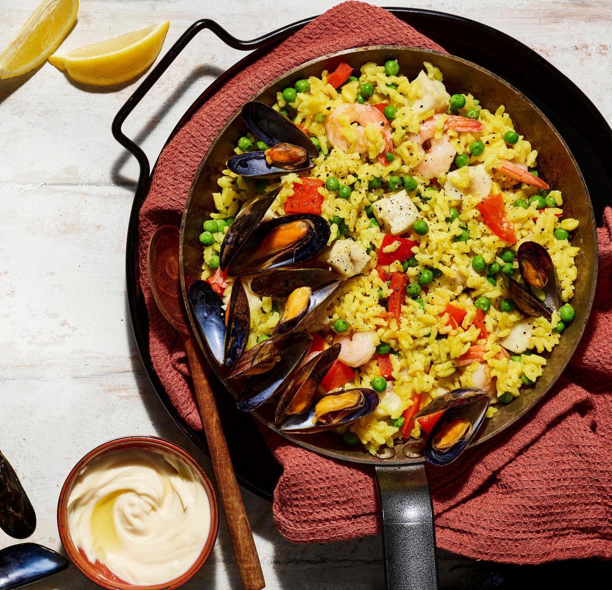 Leikkaa sitruuna lohkoiksi pinnalle ja tarjoa paella valkosipulimajoneesin kanssa.